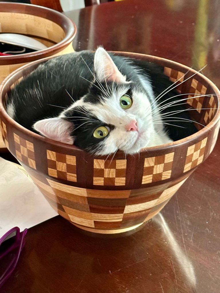 Side note: The long haired authority’s uncle makes these amazing custom wooden bowls and they are also available for purrrchase. (Cat not included)