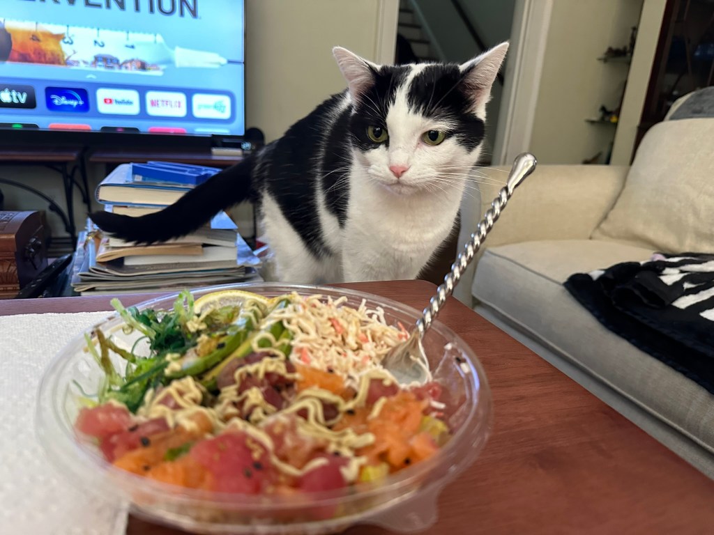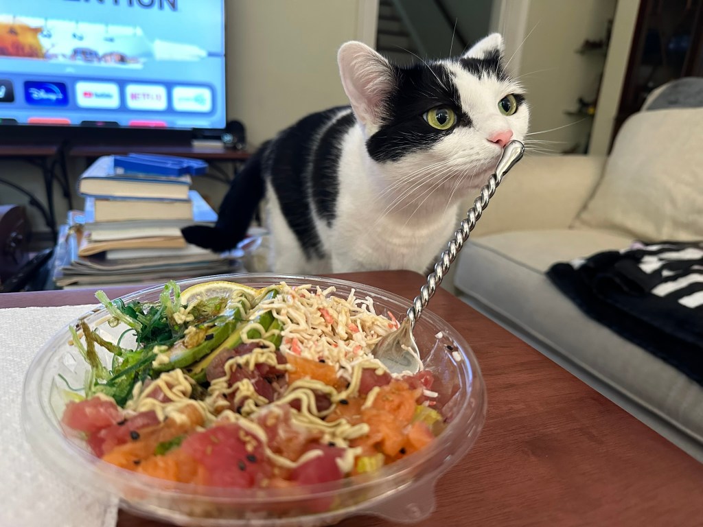 The photos below are in order of operation. In the end, I did get some samples of the poke bowl. I truly enjoyed it. I also discovered Wasabi. I jumped down and ran away. I stayed upstairs for a majority of the afternoon in a show if disapproval. The short haired one still laughs while I log this entry. I will wait until 0200 to sing the song of my people to make sure that I disturb everyone here. No one is safe.