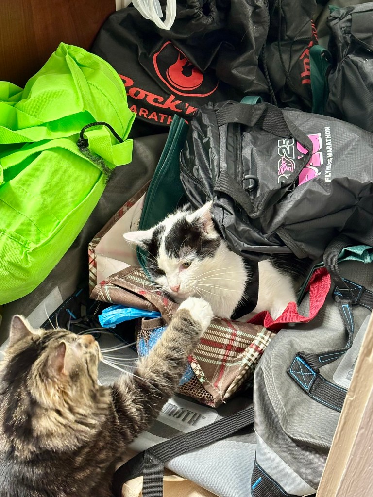 Yeah, yeah, yeah, you degenerates love the mischief posts about what I get into. Well, as of recent, that ship has sailed because the newest addition has discovered my secret bunker. Yes! The special corner where the authorities throw a surplus of assorted bags that I enjoy playing on and/or inside of. Fun fact, one of the bags in here trapped my older sister several years ago. I laughed and ran away.